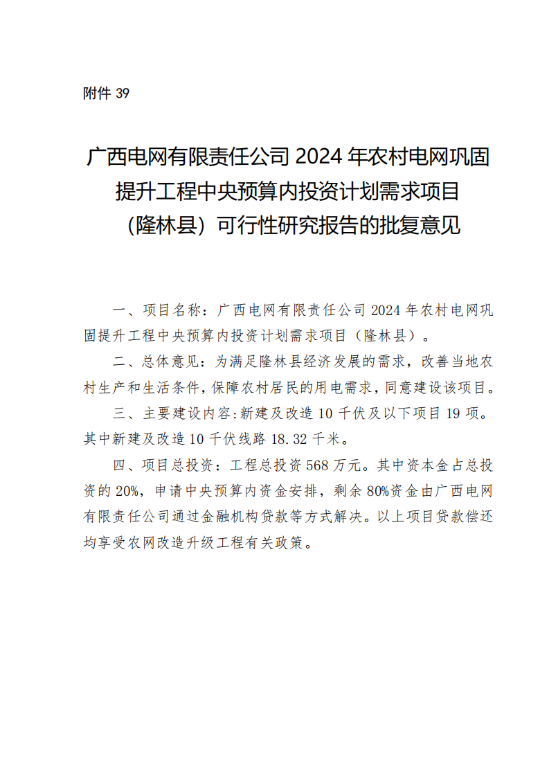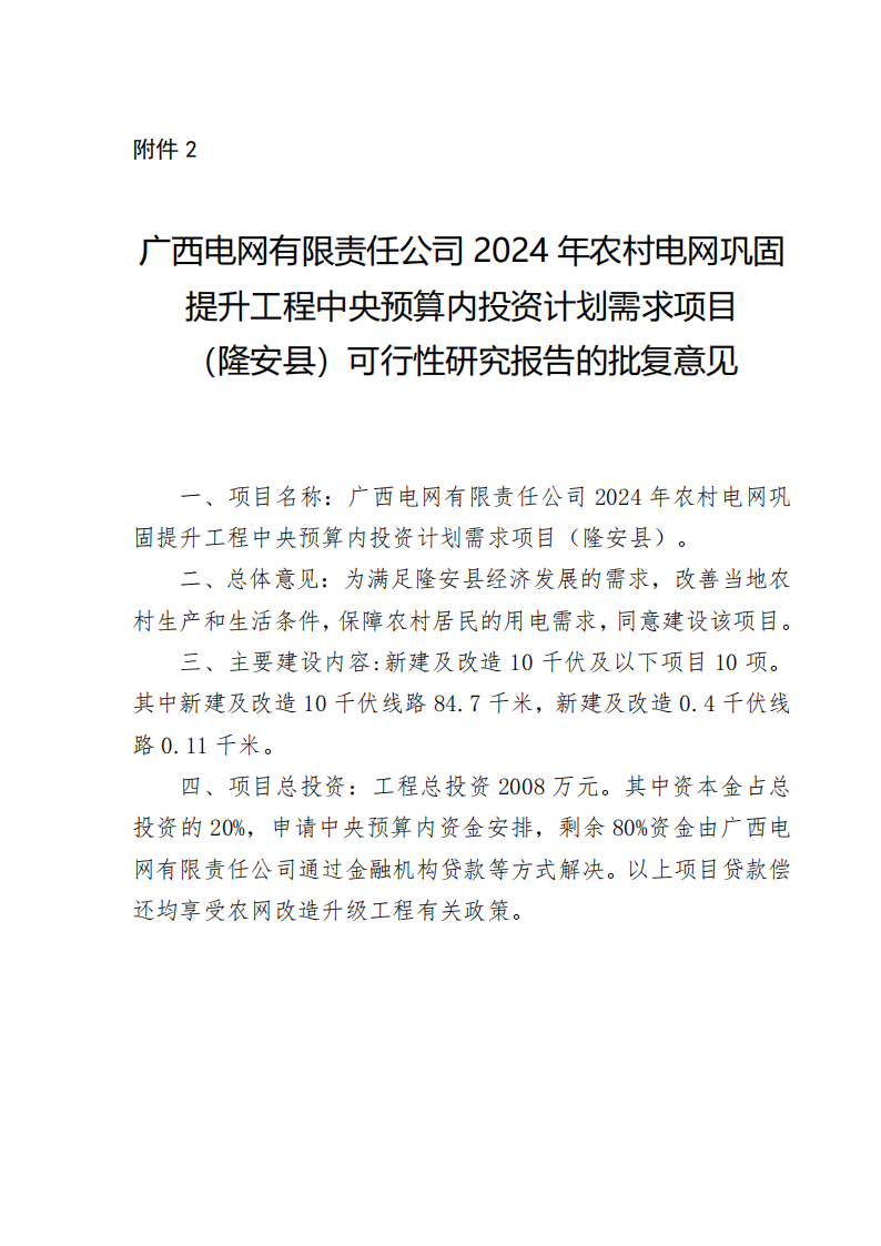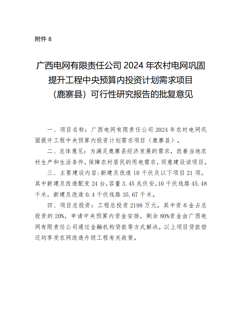 3月7日,广西电网公司2024年农村电网巩固提升工程中央预算内投资计划需求项目可行性研究报告获批复。项目总投资99735万元。本批次项目共40个,单项工程共计1539项,新建及改造10千伏配变1199台,容量233.475兆伏安,新建及改造10千伏线路1629.13千米,新建及改造0.4千伏线路2132.73千米。