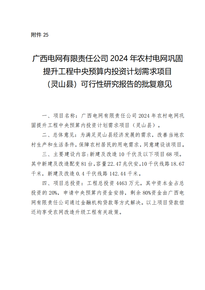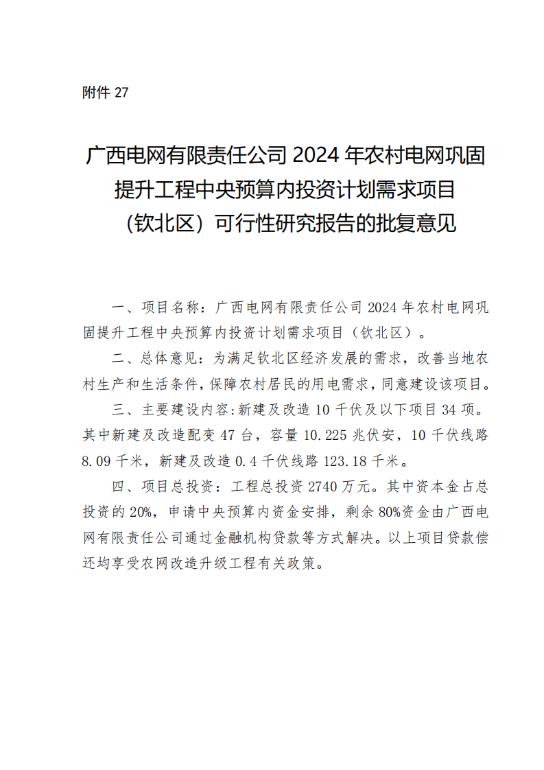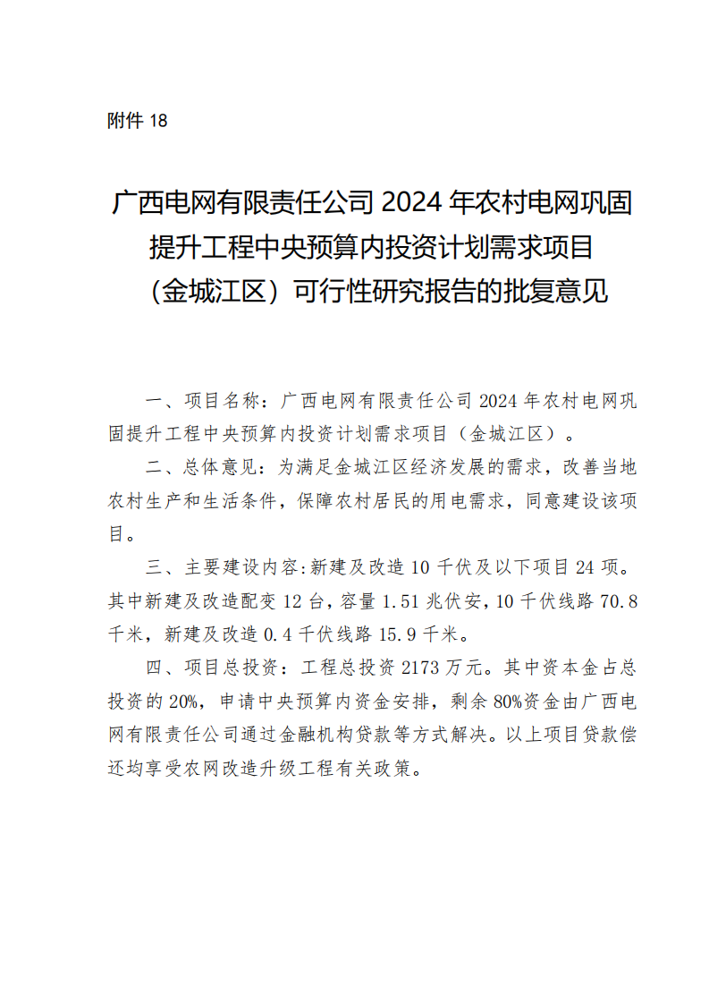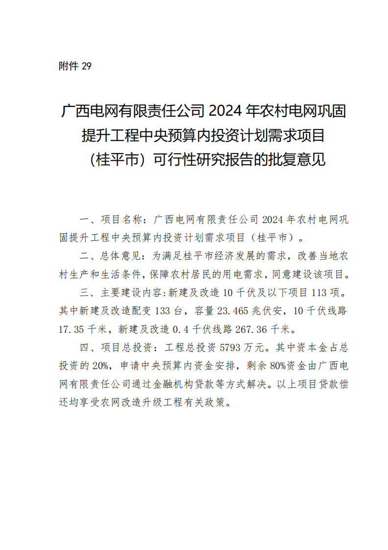 3月7日,广西电网公司2024年农村电网巩固提升工程中央预算内投资计划需求项目可行性研究报告获批复。项目总投资99735万元。本批次项目共40个,单项工程共计1539项,新建及改造10千伏配变1199台,容量233.475兆伏安,新建及改造10千伏线路1629.13千米,新建及改造0.4千伏线路2132.73千米。