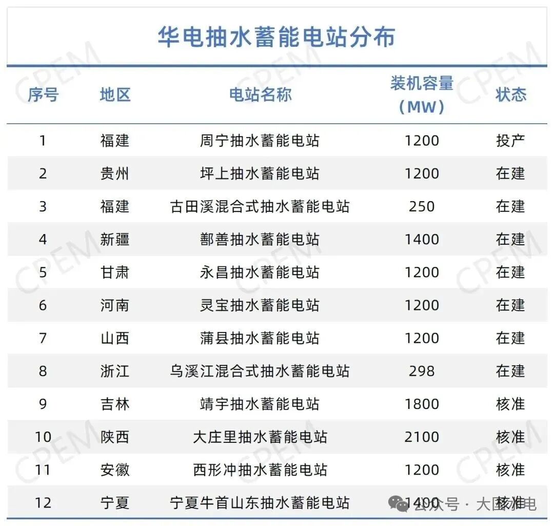 据CPEM大国水电统计,截至2025年6月,华电在运及在建/核准抽水蓄能电站12座,总装机容量约14.45GW。