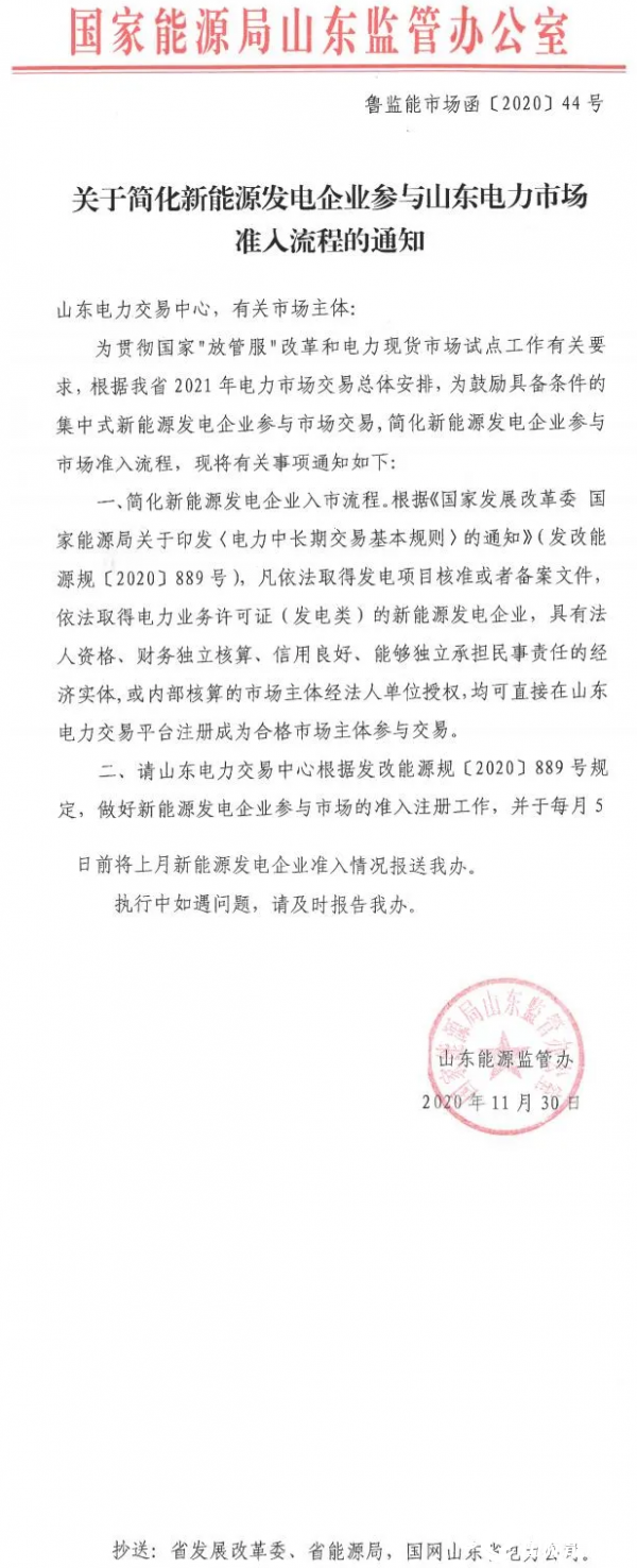 【国际能源网 讯】近日,从国家能源局山东监管办公室获悉,根据山东省2021年电力市场交易总体安排,为鼓励具备条件的集中式新能源发电企业参与市场交易,山东监管办发布《关于简化新能源发电企业参与山东电力市场准入流程的通知》。