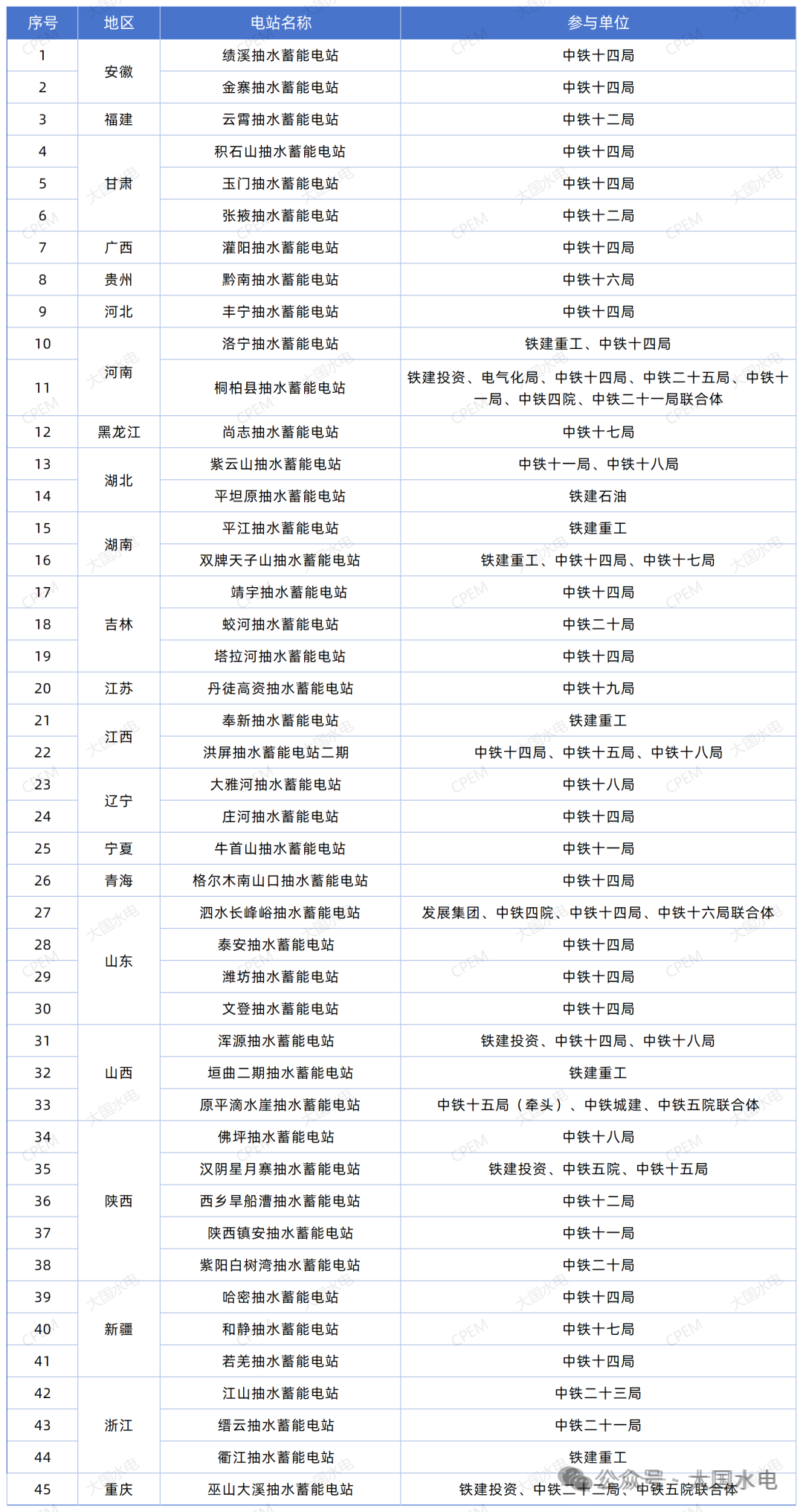 据CPEM大国水电不完全统计,中国铁建参与的抽水蓄能项目遍布了全国20多个省份,总计约45个,如下: