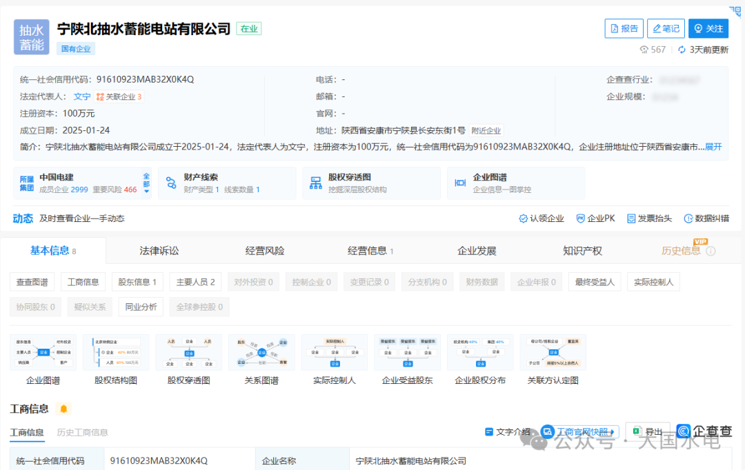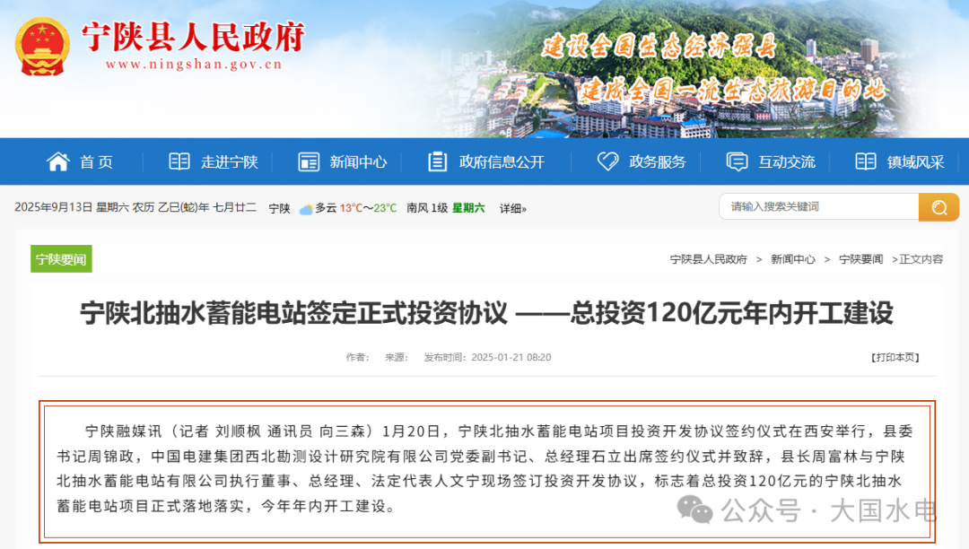 2025年1月20日,宁陕县人民政府与西北院已签订项目投资开发协议,宁陕北抽水蓄能电站有限责任公司已经成立。