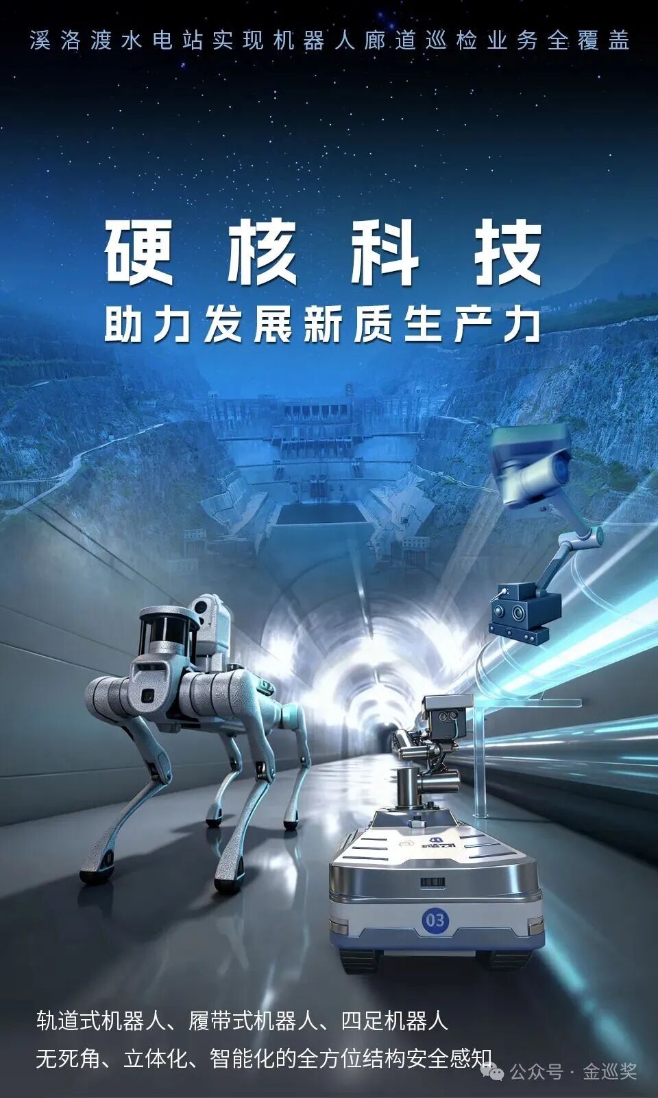 该电站拥有超大规模地下洞室群,大坝廊道总长超5公里,水垫塘廊道总长超3公里,其中水垫塘廊道呈网状结构,且存在45度爬坡,对廊道运维巡检人员体力、耐力要求较高。针对人工巡检的局限性和结构损伤的隐蔽性,溪洛渡电厂于2021年起,启动水垫塘及大坝廊道无人化巡检、多源感知、健康诊断、综合评价、管理体系等多方面关键技术研究。电厂借助巡检机器人、物联网等新技术,成功研制并投入4个轨道式机器人,3个履带式机器人,1个四足机器人,实现水垫塘及大坝廊道无死角、立体化、智能化的全方位结构安全感知。