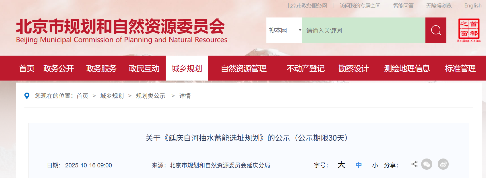 2025年10月16日,北京市规划和自然资源委员会延庆分局对延庆白河抽水蓄能电站项目的选址规划进行了公示。根据公示信息,项目位于延庆区千家店镇六道河村西部,上水库建于黄木沟,下水库利用宾榔沟的地形建设。该电站规划装机容量为100万千瓦(1000MW),是一座大型抽水蓄能电站,总用地面积约140.29公顷(具体指标以最终审批方案为准)。