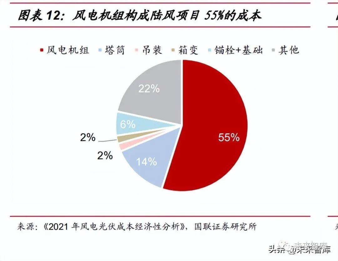 整机制造维度:降低单位制造成本。风机是风电项目最核心的成本组成,根据明 阳智能披露,风机构成我国海上风电项目 38%的成本。以金风科技和三一重能为例, 金风科技 3~4MW 的风机成本降至 2500 元/kW 附近,较 1.5~2MW 的风机平台在功 率提升一倍后单位成本降幅约 25%。三一重能 4MW 和 5MW 风机成本已经分别降 至 1800 元/kW 和 1600 元/kW,与 2MW 和 2.5MW 的风机平台相比,功率提升一倍, 单位成本降幅达 30-40%。