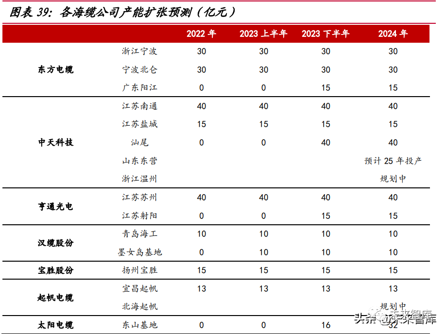 疫情因素减弱,叠加海缆较高的毛利率,海缆企业扩大产能的动机较强。东方电 缆阳江基地、中天科技(维权)汕尾基地和亨通光电射阳基地 2023 年下半年投产,预计分别 扩大产能 15 亿、40 亿和 15 亿;汉缆股份墨女岛已建成,投产时间预计在 23 年初, 扩产可达 10 亿;太阳电缆正在建设东山海缆生产基地,产能可达 32 亿。