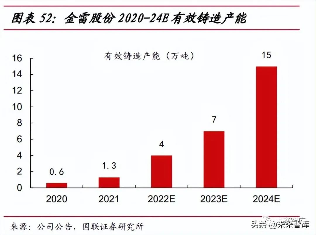 海风引领主轴锻改铸趋势。风机大型化趋势下主轴铸造工艺趋势明确,随着大 型海上风机主轴尺寸越来越大,锻造主轴因为生产设备的限制,不适用于大型风机;同时直驱和半直驱机型份额占比增加,主轴在中低速传动工况下相比于双馈高速传 动性能要求略有降低,部分风电整机供应商基于降本压力及轻量化的需求,铸造主 轴占比将有望提升。龙头金雷股份(44.320, -1.12, -2.46%)优势明显。金雷股份东营海上风电核心部件数字化制造项目也在 持续推进中,项目规划铸造产能共 40 万吨,目前一期工程已开工建设,规划产能 10 万吨,预计将于 2023 年中旬投产,贡献 50%的产能,2023 年预计公司铸造产 能有望达到 7-8 万吨,2024 年有望达到 15 万吨。