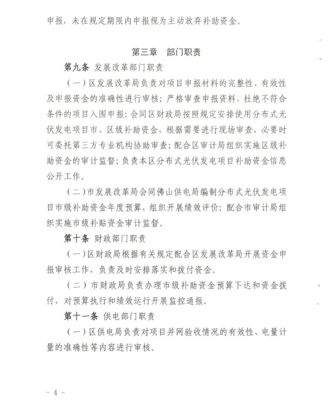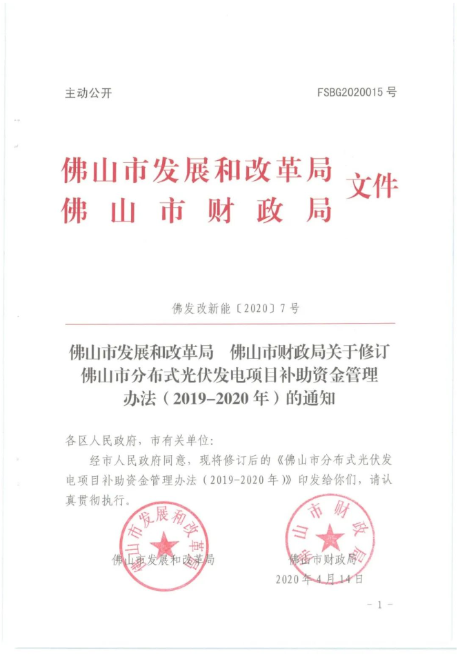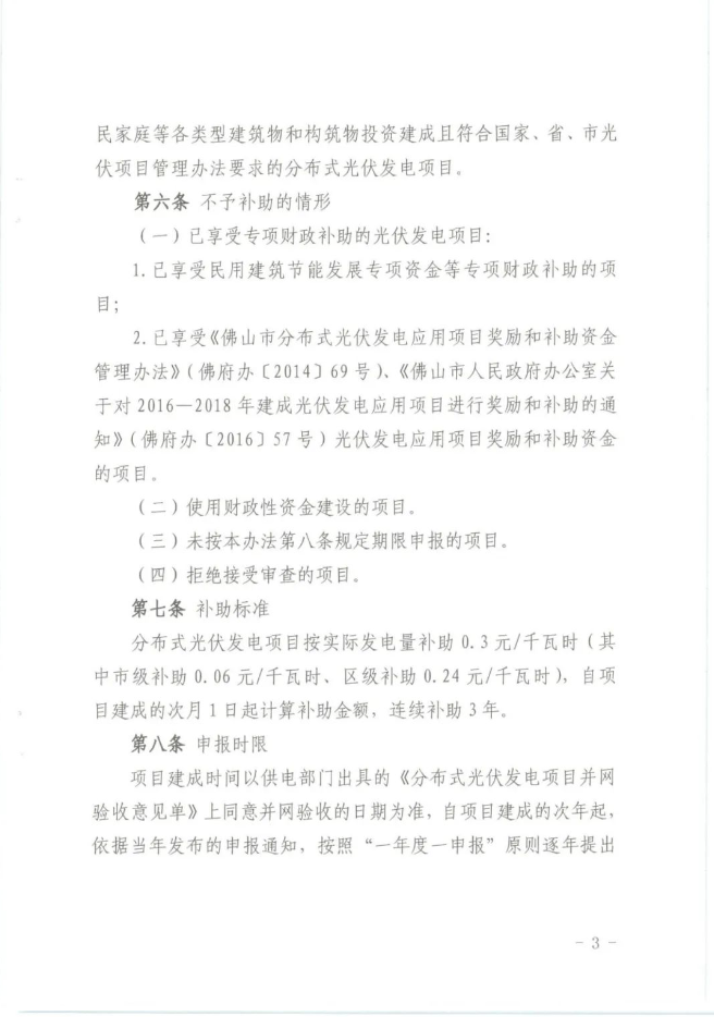 通知明确,对2019—2020年在禅城区利用工业、商业、交通、公共机构、居民家庭等各类型建筑物和构筑物建成且符合国家、省、市光伏项目管理办法要求的分布式光伏发电项目按实际发电量补助0.3元/千瓦时(其中市级补助0.06元/千瓦时、区级补助0.24元/千瓦时),自项目建成的次月1日起计算补助金额,连续补助3年。(项目建成时间按供电部门出具的《并网验收意见单》上并网验收时间为准)