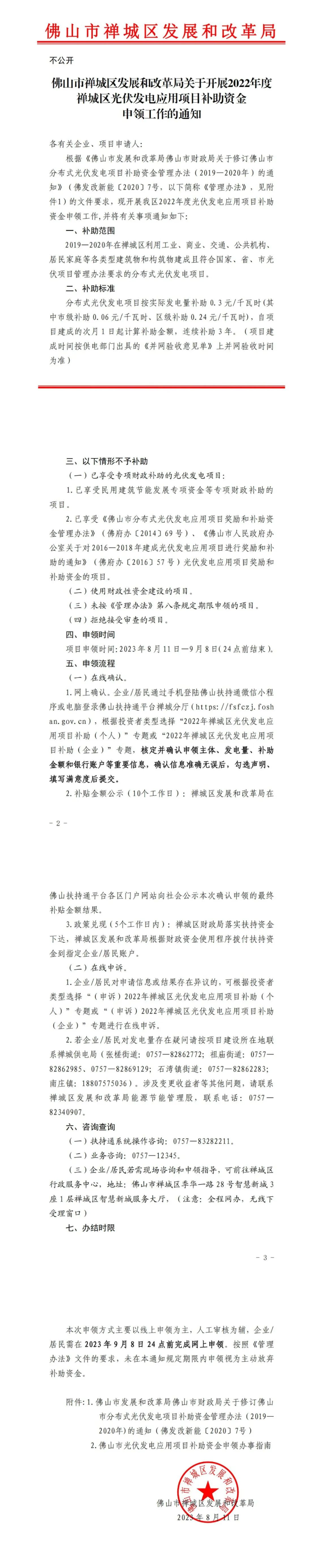 8月11日,广东省佛山市禅城区发展和改革局关于开展2022年度禅城区光伏发电应用项目补助资金申领工作的通知。