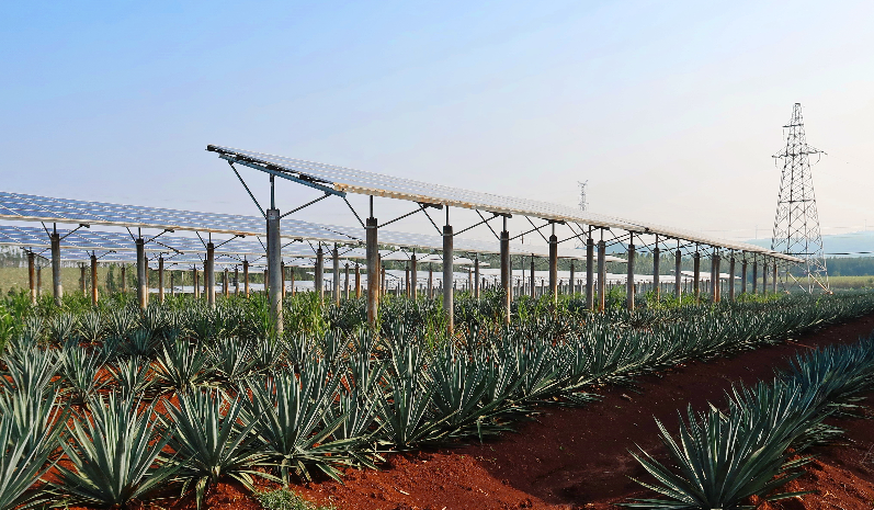 在祖国大陆的最南端——湛江市徐闻县,广东粤电东方红农场农业光伏综合开发项目光伏阵列下方及周边种植了大批量剑麻,一垄垄墨绿色的剑麻整齐排列在铁锈色的红土地上,红绿相间,宛如油画一般。